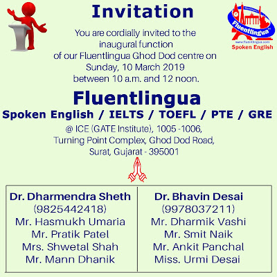 MISC Inauguration of Fluentlingua Ghod Dod centre on 10 March 2019 ByDharmendra Sheth March 3, 2019August 29, 2024 I am looking forward to the inauguration of our Ghod Dod Centre.